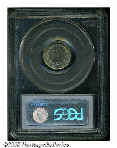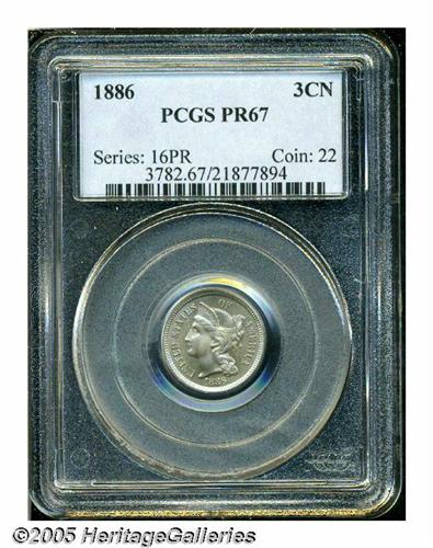 <B>1886<3CN> PR67 PCGS.</B></I> This lovely proof is bathed in a mix of pastel light green, violet, yellow-gold, and rose toning which overlies immaculately preserved surfaces. The design elements are exquisitely struck, with no areas displaying hints of softness. This is one of the most beautiful Proof Three Cent Nickels seen by this cataloger. Population: 45 in 67, 3 finer (6/05).