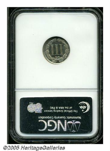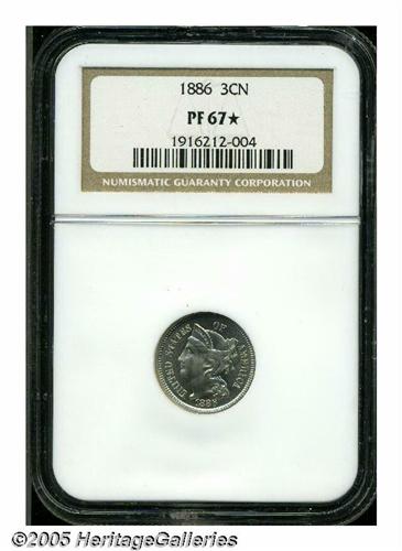 <B>1886<3CN> PR67 <S NGC.</B></I> Bright partially prooflike surfaces display a few traces of light tan patina, and a few tiny pepper-like specks over the obverse motif. The design features are well struck, and there are no mentionable contact marks. Population: 2 in 67 <S, 1 finer (4/05).