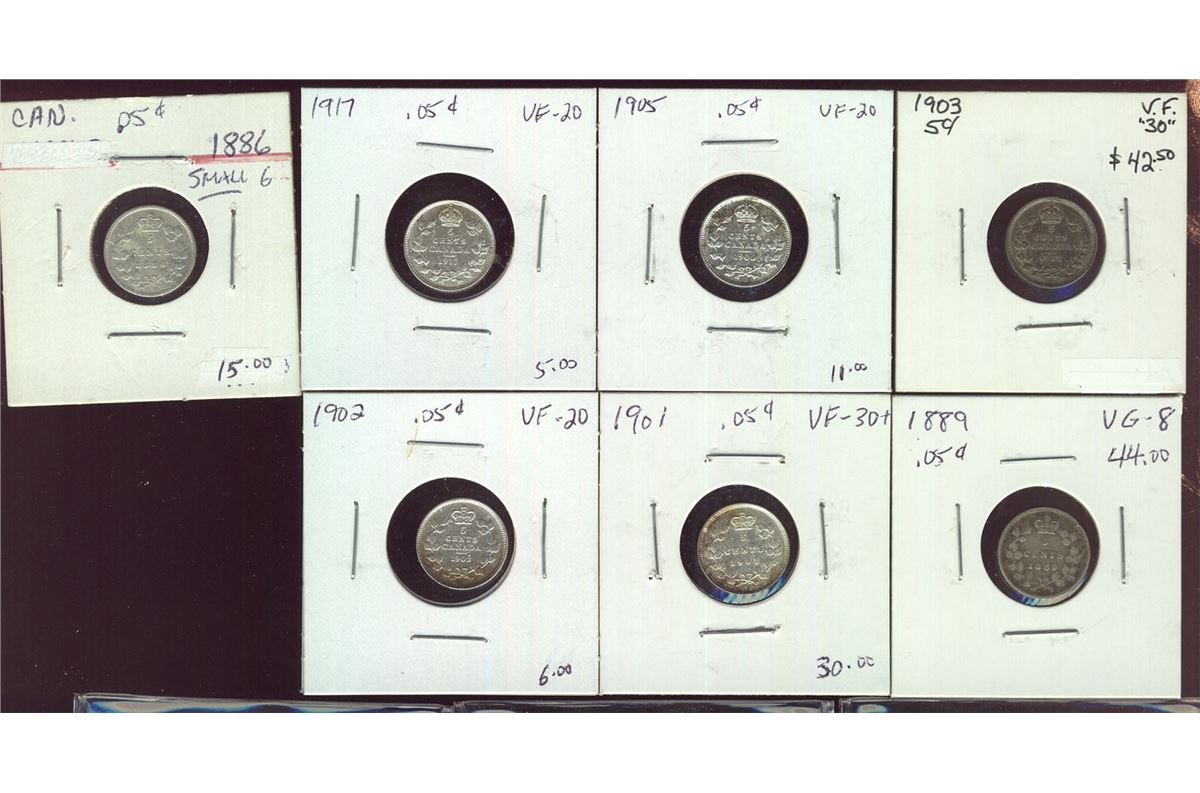 1886 5¢, 1889 both VG, 1901, 1902, 1903, 1905 & 1917 VF to VF+. Nice lot of 7 coins.