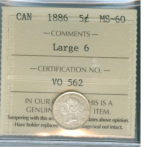 1886 5¢ Large 6 ICCS MS60. Golden white with lots of lustre.