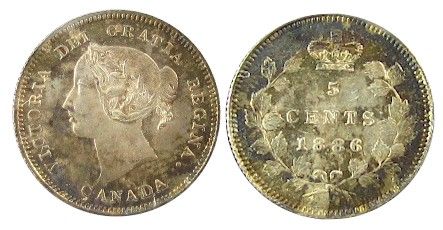 1886 5¢ Lg 6 ICCS MS64. Rare in this condition. Nicely toned.