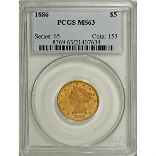 <B>1886 $5 MS63 PCGS.</B></I> PCGS Population (33/13). NGC Census: (50/17). Mintage: 388,300. Numismedia Wsl. Price for NGC/PCGS coin in MS63: $1,125. (#8369)<BR><BR><B>Coin Engraver:</B> Christian Gobrecht<BR><BR><b>Shipping:</b> Coins & Currency (<a target="_blank" href="http://www.heritageauctions.com/common/shipping.php">view shipping information</a>)