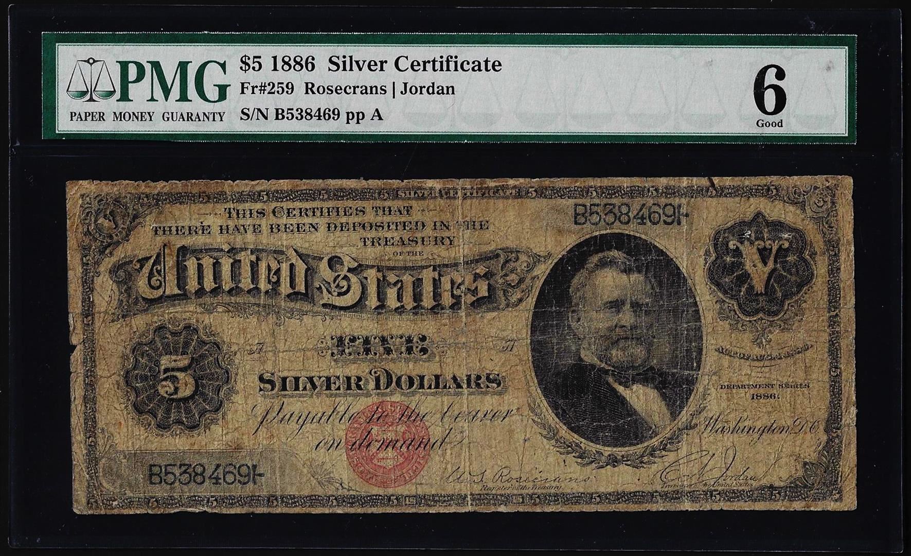 One 1886 $5 Silver Certificate Note Fr.259 PMG Good 6. PMG Certified.