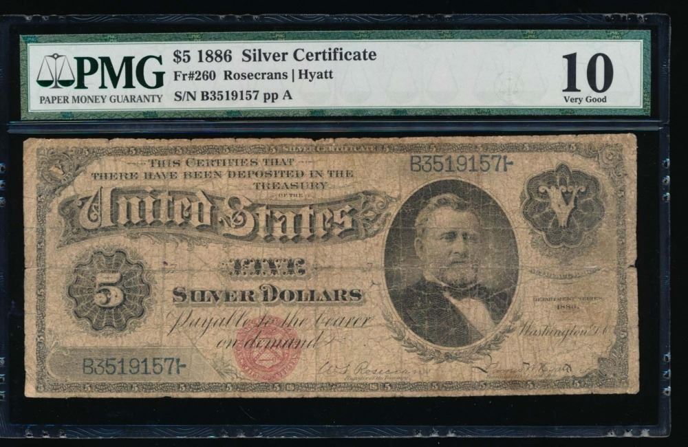 One 1886 $5 Silver Certificate PMG 10 Very Good.