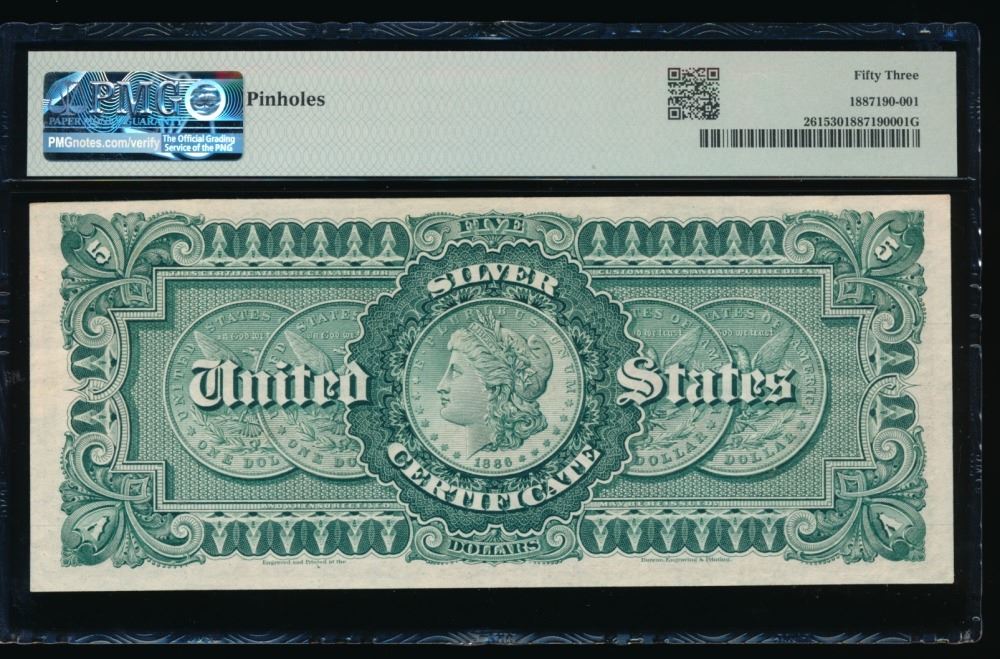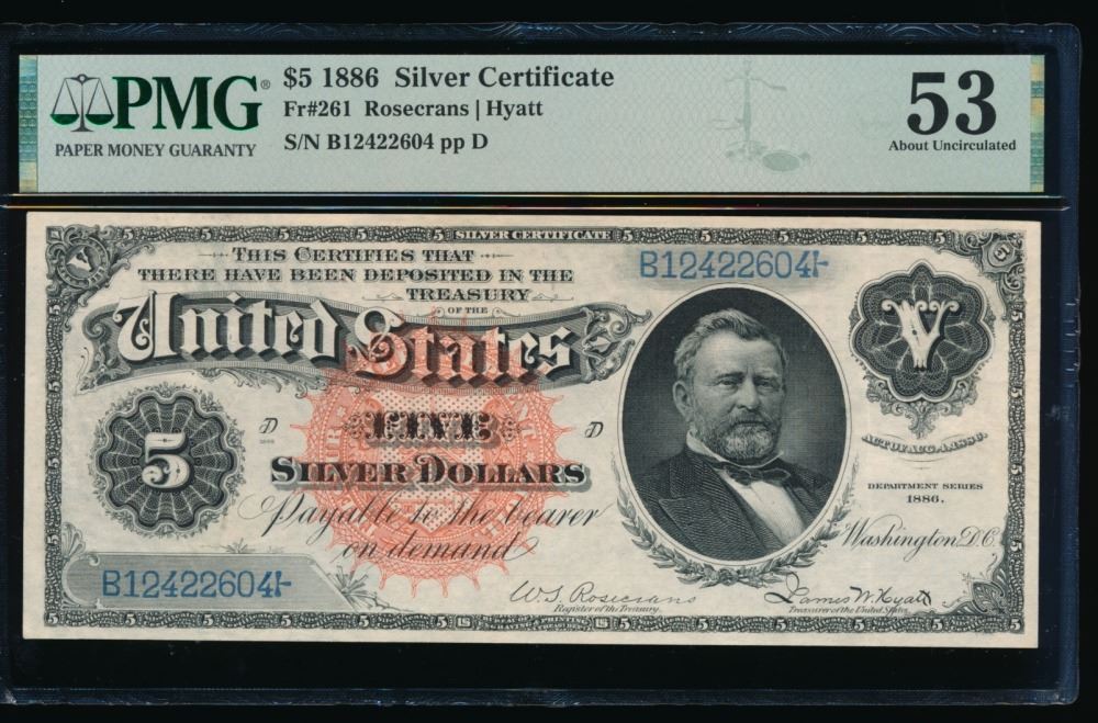 One 1886 $5 Silver Certificate PMG 53.