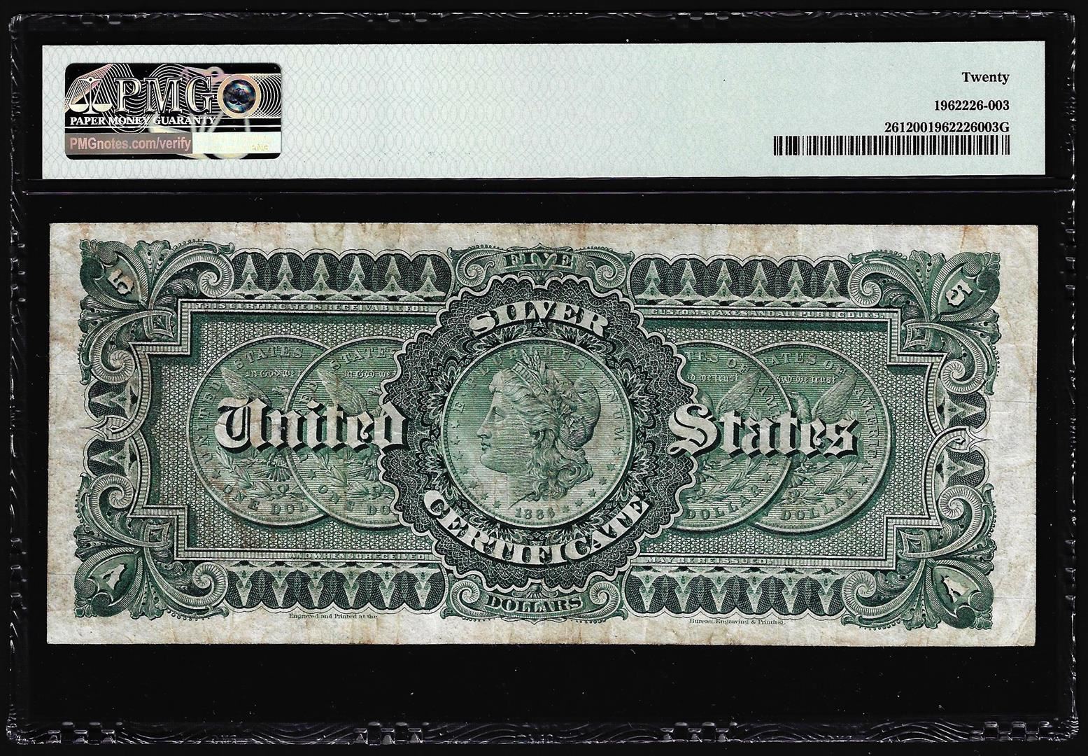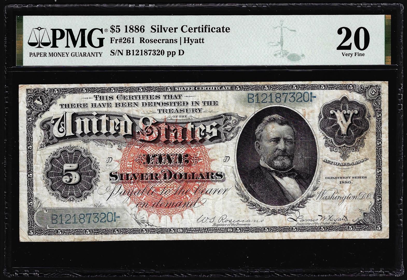 One 1886 $5 Silver Dollar Back Silver Certificate Note Fr.261 PMG Very Fine 20. PMG Certified.
