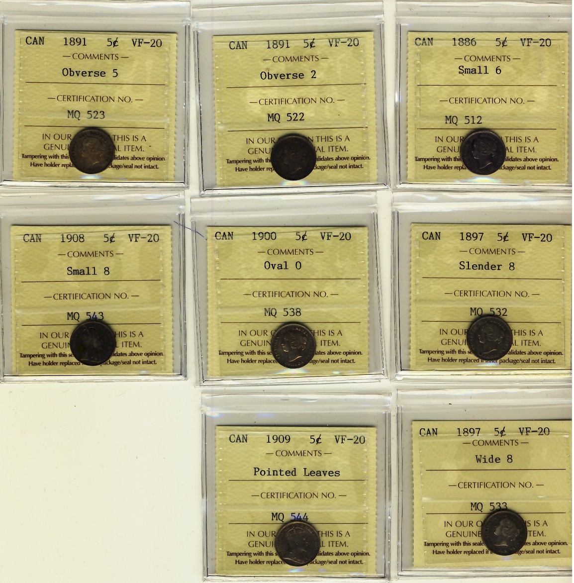 1886 5¢ Sml, 1891 Obv 2, 1891 Obv 5, 1897 Slender, 1897 Wide, 1900 Oval, 1908 Sml & 1909 Ptd Lvs all ICCS VF20. Lot of 8 coins.