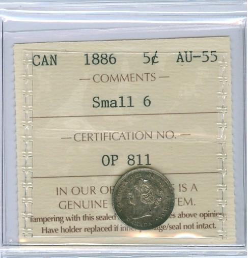 1886 5¢ Sml 6 ICCS AU55. Brownish tint w/lots of underlying lustre.