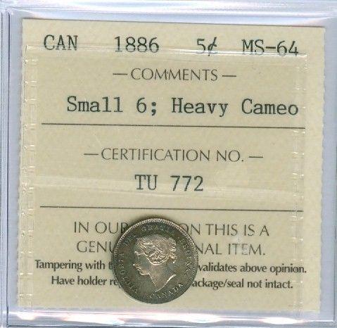 1886 5¢ Sml 6 ICCS MS64 Heavy Cameo. Golden brown tone and flashy cameo finish on obverse portrait. ICCS Top 5, plus the HC designation. Excessively scarce!