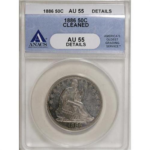 <B>1886 50C --Cleaned--ANACS AU55 Details.</B></I> NGC Census: (4/61). PCGS Population (6/84). Mintage: 5,000. Numismedia Wsl. Price for NGC/PCGS coin in AU55: $610. (#6368)<BR><BR><B>Coin Engraver:</B> Christian Gobrecht<BR><BR><b>Shipping:</b> Coins & Currency (<a target="_blank" href="http://www.heritageauctions.com/common/shipping.php">view shipping information</a>)