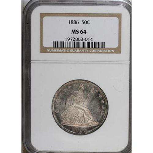 <B>1886 50C MS64 NGC.</B></I> Sharply struck with reflective fields and frosty devices, the surfaces are mostly brilliant with splashes of lilac and steel-blue toning on both sides. Just 5,000 circulation strikes were minted, and high quality survivors are elusive. Census: 26 in 64, 13 finer (8/07).<BR><BR><B>Coin Engraver:</B> Christian Gobrecht<BR><BR><b>Shipping:</b> Coins & Currency (<a target="_blank" href="http://www.heritageauctions.com/common/shipping.php">view shipping information</a>)