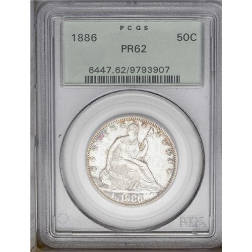 <B>1886<50C> PR62 PCGS.</B></I> Flashy surfaces exhibit variegated aqua, rose, and tan patina. The major devices are frosty, but the green label insert does not recognize the Cameo designation. A combined 5,886 business strikes and proofs were produced.<BR><I>From The Steve Glenn Collection.</B></I> <BR><BR><B>Important notice:</B> Heritage usually auctions material at the rate of 200-250 lots per hour. On some occasions eBay Live bid software or the Internet may not be able to keep up with the pace of the auction. We recommend placing a realistic absentee bid now as insurance to avoid disappointment. Occasionally the auctioneer may eliminate or reject an eBay Live bid, and the auctioneer may also reopen a lot after the close of the eBay live bidding (usually because we missed an audience bid), and may reject your bid even if it shows you as the winning bidder. By bidding via eBay Live, you agree that Heritage may award the lot to another bidder at its sole discretion under the circumstances described above or any other reasonable circumstances. Since eBay bids are not shown to us until we open the lot on the floor, we treat those bids just like floor bids. In most cases the floor responds before the eBay bid is presented to us, due to Internet lag time, so for consistency we have made it a policy that floor bids are always considered first over tie eBay live bids. Also please note that all Heritage lots purchased through eBay Live carry a 20% Buyer's Premium. Please make sure you read the Terms and Conditions before you bid. This lot is being auctioned in conjunction with a live floor auction by Heritage Galleries & Auctioneers. All final auction and invoice information will be supplied by Heritage Galleries & Auctioneers, and all other information should be considered preliminary. Lot:2039 <BR><BR><B>Winning Notification and Billing:</B> After the FINAL session in this auction is complete, Heritage will send e-mail and snail mail invoices. This process normally takes several days. All final auction and invoice information will be supplied by Heritage Galleries & Auctioneers, and all other information should be considered preliminary. <BR><BR>This auction will be conducted on a live auction floor and over the Internet through eBay Live. If you choose to place an absentee bid, please take a moment to <font color='#0000ff'><u><a href='http://pages.ebay.com/liveauctions/help/before/laabsentee.html'>learn how eBay Live absentee bidding works</a></u></font><font color='#000000'>