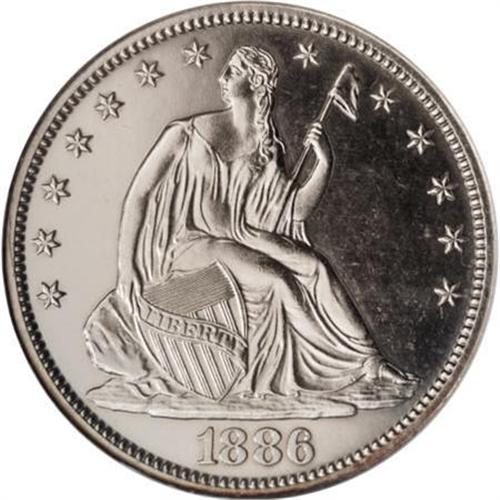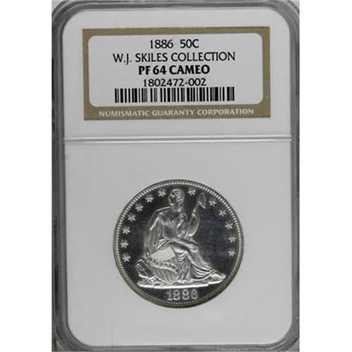 <B>1886 50C PR64 Cameo NGC.</B></I> Ex: W.J. Skiles Collection. Stone-white at first glance, although a faint band of apricot toning adorns UNITED STATES. Razor-sharp aside from trivial merging of detail on the eagle's ankle. A mere 886 proofs were struck, in addition to only 5,000 commercial pieces. Census: 8 in 64 Cameo, 10 finer (8/07).<BR><I>Ex: FUN Signature (Heritage, 1/05), lot 7418, which realized $1,955.<BR>From The Mario Eller Collection, Part One.</B></I><BR><BR><b>Shipping:</b> Coins & Currency (<a target="_blank" href="http://www.heritageauctions.com/common/shipping.php">view shipping information</a>)