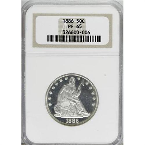 <B>1886 50C PR65 NGC.</B></I> This piece displays noteworthy cameo contrast on the obverse which only diminishes slightly on the reverse. The design motifs are as crisply detailed as expected, for a proof specimen. Free of grade-limiting hairlines or contact remnants; a lovely Gem proof. A conditionally scarce issue at this level, which is under added market pressure due to the scant number of business strikes produced. Census: 23 in 65, 27 finer (5/07). <BR><I>From The Vanek Collection.</B></I><BR><BR><b>Shipping:</b> Coins & Currency (<a target="_blank" href="http://www.heritageauctions.com/common/shipping.php">view shipping information</a>)
