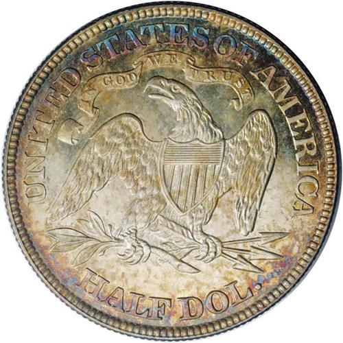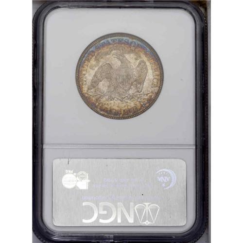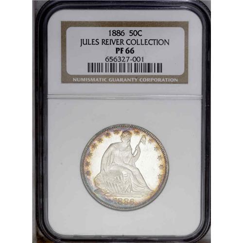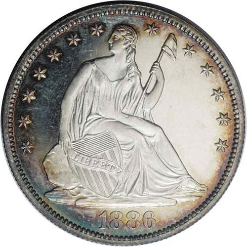 <B>1886<50C> PR66 NGC.</B></I> The 1886 is one of several low mintage P-mint issues at the end of the Seated Half Dollar series. In this particular year, only 5,000 business strikes and 886 proofs were produced. This is among the finest certified survivors of the latter delivery. The design elements are exquisitely struck, and the frosted obverse motif contrasts with deeply mirrored fields. Wisps of blue, russet, and lavender toning gravitate to the rims.