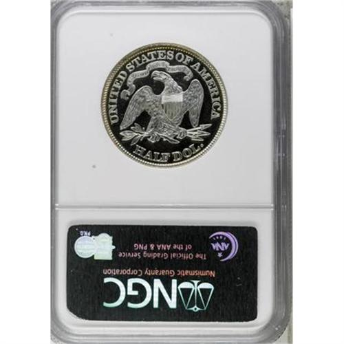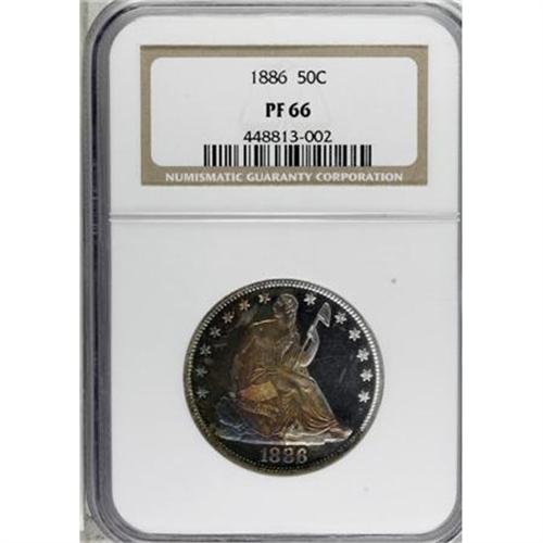 <B>1886 50C PR66 NGC.</B></I> One of only 886 proofs struck in this low total mintage year. This is an absolutely splendid half dollar. The fields are deeply mirrored and the obverse has a large swath of golden-brown and blue toning that gives a strong accent against the brilliance seen elsewhere on that side. The reverse is completely brilliant. While not listed on the NGC insert, there is a noticeable amount of mint frost over the devices which provides a moderate contrast. Census: 20 in 66, 7 finer (5/07).<BR><BR><b>Shipping:</b> Coins & Currency (<a target="_blank" href="http://www.heritageauctions.com/common/shipping.php">view shipping information</a>)