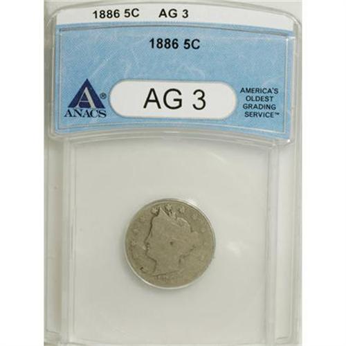 <B>1886 5C AG3 ANACS.</B></I> NGC Census: (8/278). PCGS Population (6/378). Mintage: 3,330,290. (#3847)<BR><BR><B>Coin Engraver:</B> Charles E. Barber<BR><BR><b>Shipping:</b> Coins & Currency (<a target="_blank" href="http://www.heritageauctions.com/common/shipping.php">view shipping information</a>\)