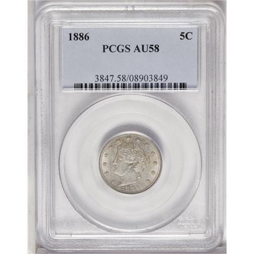 <B>1886<5C> AU58 PCGS.</B></I> A wispy die crack encircles the periphery on both sides. Steel-blue and olive-gold toning appear in a mildly dappled fashion. Well struck except for the reverse left ear of corn, with minimal wear and a few noticeable contact marks on the reverse.
