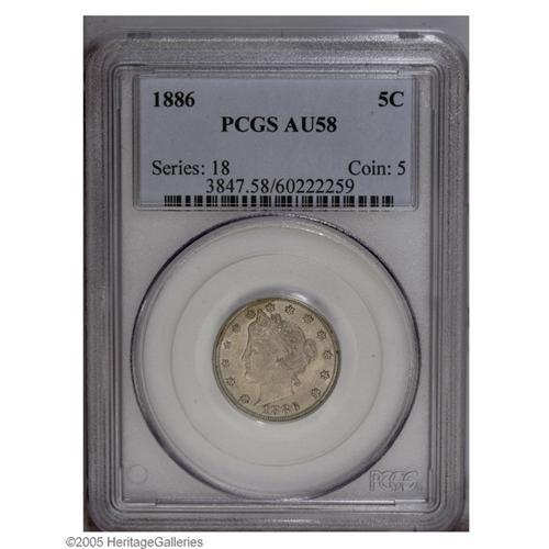 1886 5C AU58 PCGS. An attractive semi-key date with mu 1886[5C] AU58 PCGS.