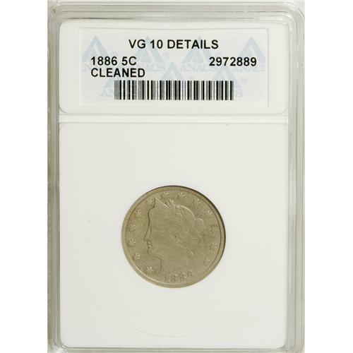 <B>1886 5C --Cleaned--ANACS. VG10 Details.</B></I> NGC Census: (21/519). PCGS Population (10/345). Mintage: 3,330,290. Numismedia Wsl. Price for NGC/PCGS coin in VG10: $250. (#3847)<BR><BR><b>Shipping:</b> Coins & Currency (<a target="_blank" href="http://www.heritageauctions.com/common/shipping.php">view shipping information</a>)