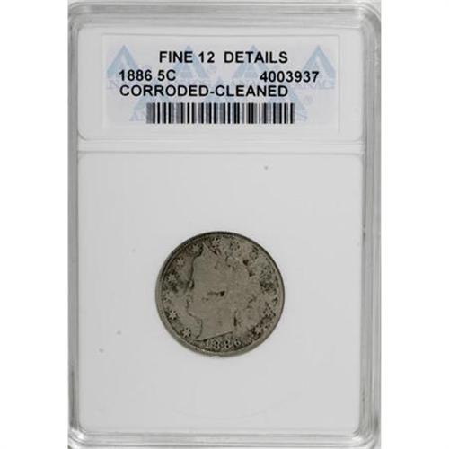 <B>1886 5C --Cleaned, Corroded--ANACS. Fine12 Details.</B></I> NGC Census: (6/243). PCGS Population (13/350). Mintage: 3,330,290. Numismedia Wsl. Price for NGC/PCGS coin in F12: $325. (#3847)<BR><BR><B>Coin Engraver:</B> Charles E. Barber<BR><BR><b>Shipping:</b> Coins & Currency (<a target="_blank" href="http://www.heritageauctions.com/common/shipping.php">view shipping information</a>)