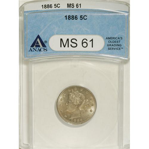 <B>1886 5C MS61 ANACS.</B></I> Lustrous and satiny with a pleasing cartwheel sheen noted across each side. Generally bold with typical slight softness on the reverse left ear of corn. One of the key dates in this popular series.<BR><BR><b>Shipping:</b> Coins & Currency (<a target="_blank" href="http://www.heritageauctions.com/common/shipping.php">view shipping information</a>)