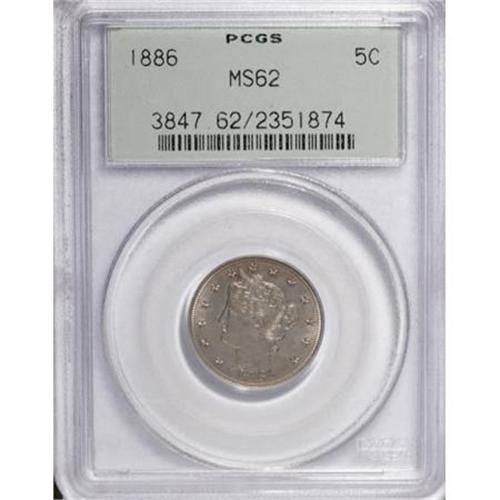 <B>1886 5C MS62 PCGS.</B></I> This straw-gold key date nickel has a penetrating strike and lacks consequential marks. The luster is subdued, and the reverse has a couple of unimportant, small spots. In an old green label holder.<BR><BR><B>Coin Engraver:</B> Charles E. Barber<BR><BR><b>Shipping:</b> Coins & Currency (<a target="_blank" href="http://www.heritageauctions.com/common/shipping.php">view shipping information</a>)