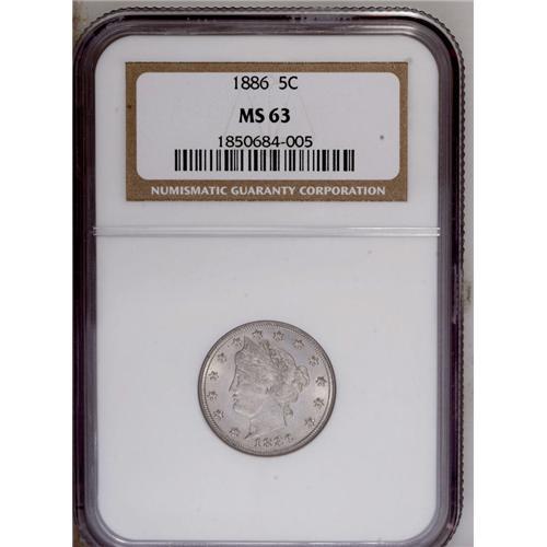 <B>1886<5C> MS63 NGC.</B></I> Unusually sharp for a business strike, and the cartwheel luster is vivacious. This lightly toned and spot-free key date example is certain to please the specialist.