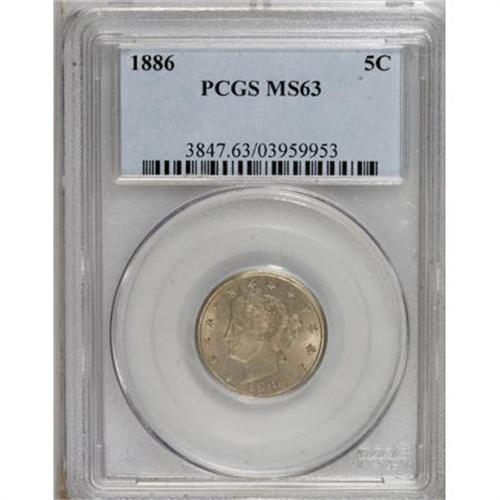 <B>1886 5C MS63 PCGS.</B></I> Softly struck on most of the obverse stars, and on the reverse left ear of corn. This example exhibits satin luster and light khaki-gray coloration. Abrasions are not found on either side of this Select Mint State nickel. <BR><BR><B>Coin Engraver:</B> Charles E. Barber<BR><BR><b>Shipping:</b> Coins & Currency (<a target="_blank" href="http://www.heritageauctions.com/common/shipping.php">view shipping information</a>)