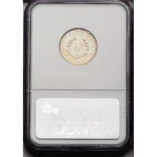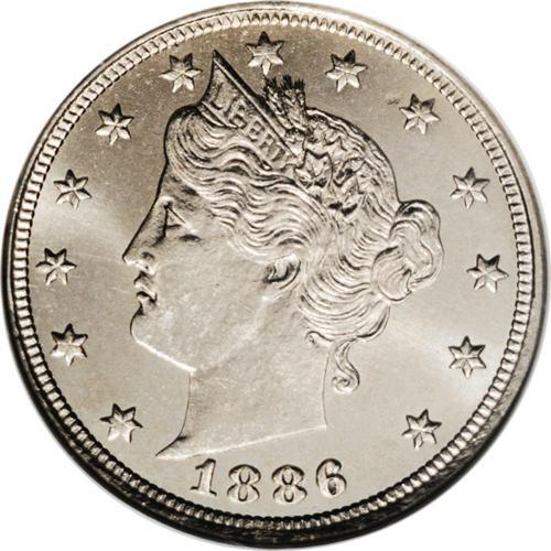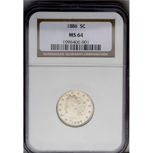 <B>1886<5C> MS64 NGC.</B></I> Softly struck on the obverse peripheral stars, and on the lower left wreath and left ear of corn, with numerous wispy die striations on each side. Liberty's portrait reveals uneven surface textures, as made due to minor die roughness. One of the three keys in the Liberty nickel series and far scarcer in Uncirculated than as a proof. Census: 55 in 64, 24 finer (4/06).