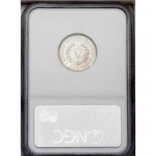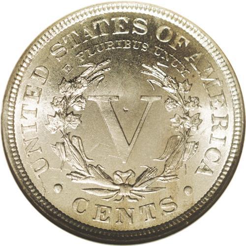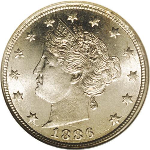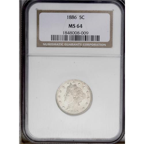 <B>1886<5C> MS64 NGC.</B></I> This is a highly lustrous near-Gem example with frosty light gray surfaces and splashes of golden-brown toning. Most of the design elements are boldly detailed, although many of the stars on the obverse are flat. The lower left part of the wreath is also weakly defined. Struck from a late die state with extensive peripheral die cracks on both sides. Business strike examples of 1885 and 1886 Liberty nickels are elusive, especially in higher numerical grades. Census: 55 in 64, 24 finer (4/06).