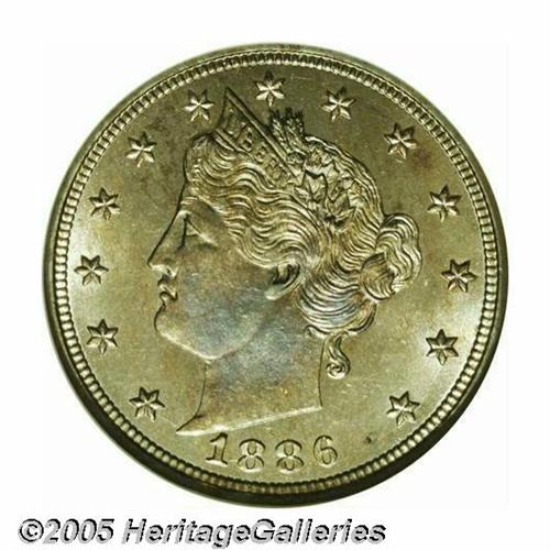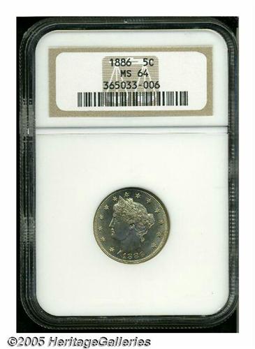 <B>1886<5C> MS64 NGC.</B></I> This key issue exhibits light, streaky toning on the reverse. A circular area of gray toning is seen at the center of the obverse under which a tiny planchet anomaly is noted. Unusually well struck for this often weak issue. Population: 47 in 64, 24 finer (3/05).