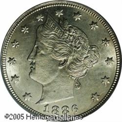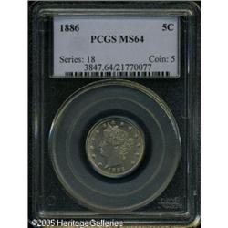 <B>1886 5C MS64 PCGS.</B></I> Well struck for this semi-key issue, displaying a bright, satiny appearance overall and a network of die cracks about the obverse periphery. While occasionally found in marginal Uncirculated condition, Choice and better examples of this lower mintage date are legitimately scarce. Population: 55 in 64, 26 finer (1/05). Lot:5878
