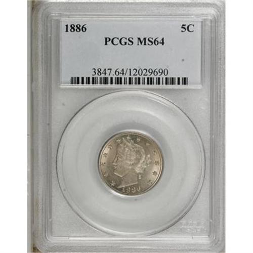 <B>1886 5C MS64 PCGS.</B></I> Wispy champagne toning accents the satiny surfaces of this Choice Mint State piece. It is fully lustrous with full underlying brilliance. A key date among business strike Liberty nickels, with just 34 finer examples certified by PCGS. Old-time collectors generally preferred proofs, so the business strikes were ignored.<BR><BR><B>Coin Engraver:</B> Charles E. Barber<BR><BR><b>Shipping:</b> Coins & Currency (<a target="_blank" href="http://www.heritageauctions.com/common/shipping.php">view shipping information</a>)