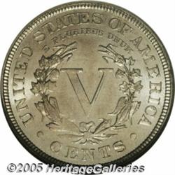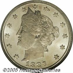 <B>1886 5C MS65 NGC.</B></I> The strike is not full on the lower left wreath and stars, but the portrait is well struck. A mildly prooflike Gem that has a smidgen of honey-gold and lilac patina. An impressively preserved key date Liberty Nickel. Population: 21 in 65, 3 finer (2/05).