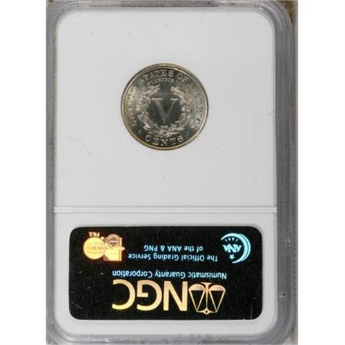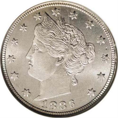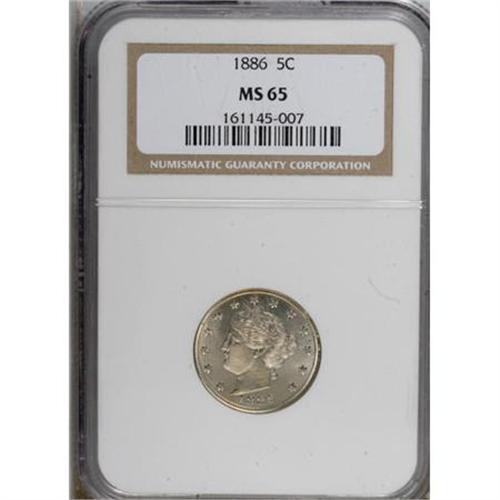 <B>1886 5C MS65 NGC.</B></I> An attractive example of this key Liberty nickel issue, well-defined in the centers, though the stars and peripheral wreath elements display some softness. A thin layer of golden patina drapes much of the otherwise nickel-gray, lustrous surfaces. Despite an original mintage of over 3.3 million pieces, few examples were saved, and Mint State coins are elusive today. Census: 23 in 65, 3 finer (9/07).<BR><BR><B>Coin Engraver:</B> Charles E. Barber<BR><BR><b>Shipping:</b> Coins & Currency (<a target="_blank" href="http://www.heritageauctions.com/common/shipping.php">view shipping information</a>)