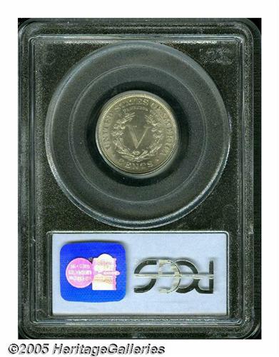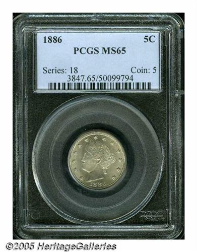 <B>1886<5C> MS65 PCGS.</B></I> An attractive example that is exceptionally well defined on each side including all the stars and the lower left portion of the wreath. The satiny surfaces display some light silver-gray patina. One of the three keys in the Liberty nickel series and far scarcer in Uncirculated than as a proof. Population: 25 in 65, 3 finer (5/05).