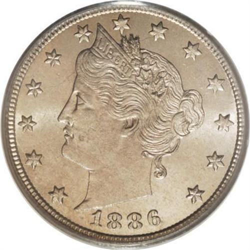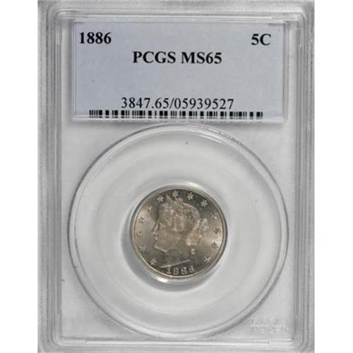 <B>1886 5C MS65 PCGS.</B></I> This intensely lustrous Gem is a great example of the 1886, a significant key date in the Liberty nickel series. Slight striking softness is noted on the reverse left ear of corn and on approximately half of the obverse stars. The sparkling surfaces are essentially untoned, except for some very faint apricot color on each side. Spidery peripheral die cracks are extensive on the reverse. <BR><BR><B>Coin Engraver:</B> Charles E. Barber<BR><BR><b>Shipping:</b> Coins & Currency (<a target="_blank" href="http://www.heritageauctions.com/common/shipping.php">view shipping information</a>)