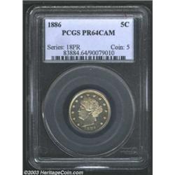 <TABLE cellSpacing=0 cellPadding=0 width="100%" bgColor=#000000 border=0><TBODY><TR><TD width="100%"><TABLE cellSpacing=1 cellPadding=3 width="100%" border=0><TBODY><TR><TD width="100%" bgColor=#79735c><FONT face=arial color=#ffffff size=3><B>Description</B> </FONT></TD></TR><TR><TD width="100%" bgColor=#ffffff><FONT face=arial size=2><B>1886 5C PR64 Cameo PCGS.</B></I> Sharply struck and well preserved, with no discernible hairlines or contact marks. The lightly frosted devices are mildly contrasted against reflective fields. Population: 1 in 64, 6 finer (8/03). </FONT></TD></TR></TBODY></TABLE></TD></TR></TBODY></TABLE><BR><A name=PricesRealized></A><TABLE cellSpacing=0 cellPadding=0 width="100%" bgColor=#000000 border=0><TBODY><TR><TD width="100%"><TABLE cellSpacing=1 cellPadding=3 width="100%" border=0><TBODY><TR><TD width="100%" bgColor=#79735c><A name=PR><FONT face=arial color=#ffffff size=3><B>Previous Prices from Heritage Auctions</B> </FONT></A></TD></TR><TR><TD bgColor=#f6f6ed><TABLE cellSpacing=0 cellPadding=0 width="100%" border=1><TBODY><TR><TD align=middle width="33%"><B>Date</B></TD><TD align=middle width="33%"><B>Service</B></TD><TD align=middle width="33%"><B>Price</B></TD></TR><TR bgColor=whitesmoke><TD width="33%"><B>07/29/2003</B></TD><TD width="33%">PCGS</TD><TD width="33%">$483.00</TD></TR></TBODY></TABLE></TD></TR><TR><TD bgColor=#ffffff><FONT face=arial size=1 ?>PLEASE NOTE: All prices realized reflect the final hammer price PLUS the buyer's premium in auctions that charge a buyer's premium. Each item has a notation at the top of the listing indicating whether that lot included a buyer's premium. Example: A item that sells with a final hammer price of $100 and a 20% buyer's premium will display with a price realized of $120. All information listed is intended to be as accurate as possible, but errors are possible. Please use this guide carefully and inform us of any inaccuracies. </FONT></TD></TR></TBODY></TABLE></TD></TR></TBODY></TABLE><BR><TABLE cellSpacing=0 cellPadding=0 width="100%" bgColor=#000000 border=0><TBODY><TR><TD width="100%"><TABLE cellSpacing=1 cellPadding=3 width="100%" border=0><TBODY><TR><TD width="100%" bgColor=#79735c colSpan=6><FONT face=arial color=#ffffff size=3><B>Price Guide*</B> </FONT></TD></TR><TR bgColor=#f6f6ed><TD align=middle><B>Grade</B> </TD><TD align=middle><B>Coin World<BR>(Trends)</B> </TD><TD align=middle><B>Numismedia<BR>Retail</B> </TD><TD align=middle><B>Numismedia<BR>Wholesale</B> </TD><TD align=middle><B>Coin<BR>Universe</B> </TD><TD align=middle><B>Heritage<BR>Value Index</B> </TD></TR><TR bgColor=#ffffff><TD align=middle>63</TD><TD align=right>---</TD><TD align=right>---</TD><TD align=right>---</TD><TD align=right>---</TD><TD align=right>$220.50</TD></TR><TR style="FONT-WEIGHT: bold" bgColor=#cccfdd><TD align=middle>64</TD><TD align=right>---</TD><TD align=right>---</TD><TD align=right>---</TD><TD align=right>---</TD><TD align=right>$238.50</TD></TR><TR bgColor=#ffffff><TD align=middle>65</TD><TD align=right>---</TD><TD align=right>---</TD><TD align=right>---</TD><TD align=right>---</TD><TD align=right>$449.25</TD></TR><TR bgColor=#ffffff><TD colSpan=6><FONT size=1>*All information listed is intended to be as accurate as possible, but errors are possible. No item may be returned or refused based on this information which is provided as a service to our customers. You should contact each pricing source directly to determine the accuracy of this information. </FONT></TD></TR></TBODY></TABLE></TD></TR></TBODY></TABLE><BR><TABLE cellSpacing=0 cellPadding=0 width="100%" bgColor=#000000 border=0><TBODY><TR><TD width="100%"><TABLE cellSpacing=1 cellPadding=3 width="100%" border=0><TBODY><TR><TD width="100%" bgColor=#79735c><FONT face=arial color=#ffffff size=3><B>Population Guide</B> </FONT></TD></TR><TR bgColor=#ffffff><TD align=middle><!-- Begin Output of Population Grid--><TABLE cellSpacing=0 cellPadding=0 width="100%" border=0><TBODY><TR><TD vAlign=center><TABLE cellSpacing=0 width="100%" border=1 cellsadding="3"><TBODY><TR><TD vAlign=center><TABLE cellSpacing=0 cellPadding=3 width="100%" border=1><TBODY><TR><TD vAlign=center align=middle bgColor=#f0f1e8 colSpan=2 <CENTER><FONT face=Arial size=2><B>PCGS Pop </B></FONT><CENTER></CENTER></TD><TD vAlign=center align=middle bgColor=#f0f1e8 colSpan=2><CENTER><FONT face=Arial size=2><B>NGC Pop</B></CENTER></FONT></TD></TR><TR><TD vAlign=center><FONT face=Arial size=2>(64)</FONT> </TD><TD vAlign=center align=right><FONT face=Arial size=2>1</FONT> </TD><TD vAlign=center><FONT face=Arial size=2>(64)</FONT> </TD><TD vAlign=center align=right><FONT face=Arial size=2>1</FONT> </TD></TR><TR><TD vAlign=center><FONT face=Arial size=2>(>64)</FONT> </TD><TD vAlign=center align=right><FONT face=Arial size=2>6</FONT> </TD><TD vAlign=center><FONT face=Arial size=2>(>64)</FONT> </TD><TD vAlign=center align=right><FONT face=Arial size=2>12</FONT> </TD></TR></TBODY></TABLE></TD></TR></TBODY></TABLE></TD></TR></TBODY></TABLE><!-- End Output of Population Grid--> Important notice: Heritage usually auctions material at the rate of 200-250 lots per hour. On some occasions eBay Live bid software or the Internet may not be able to keep up with the pace of the auction. We recommend placing a realistic absentee bid now as insurance to avoid disappointment. Occasionally the auctioneer may eliminate or reject an eBay Live bid, and the auctioneer may also reopen a lot after the close of the eBay live bidding (usually because we missed an audience bid), and may reject your bid even if it shows you as the winning bidder. By bidding via eBay Live, you agree that Heritage may award the lot to another bidder at its sole discretion under the circumstances described above or any other reasonable circumstances. Also please note that all Heritage lots purchased through eBay Live carry a 20% Buyer's Premium. Please make sure you read the Terms and Conditions before you bid.</TD></TR></TBODY></TABLE></TD></TR></TBO