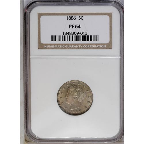 <B>1886<5C> PR64 NGC.</B></I> Vivid pink, magenta, and orange patina covers the moderately mirrored surfaces. A sharply struck piece with minor hairlines on each side.