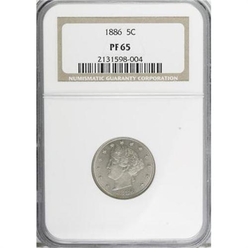 <B>1886 5C PR65 NGC.</B></I> NGC Census: (236/125). PCGS Population (264/83). Mintage: 4,290. Numismedia Wsl. Price for NGC/PCGS coin in PR65: $655. (#3884)<BR><BR><b>Shipping:</b> Coins & Currency (<a target="_blank" href="http://www.heritageauctions.com/common/shipping.php">view shipping information</a>)