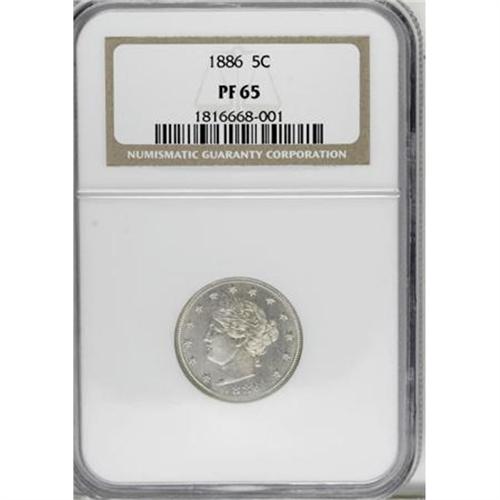 <B>1886 5C PR65 NGC.</B></I> NGC Census: (237/126). PCGS Population (267/97). Mintage: 4,290. Numismedia Wsl. Price for NGC/PCGS coin in PR65: $715. (#3884)<BR><BR><B>Coin Engraver:</B> Charles E. Barber<BR><BR><b>Shipping:</b> Coins & Currency (<a target="_blank" href="http://www.heritageauctions.com/common/shipping.php">view shipping information</a>)