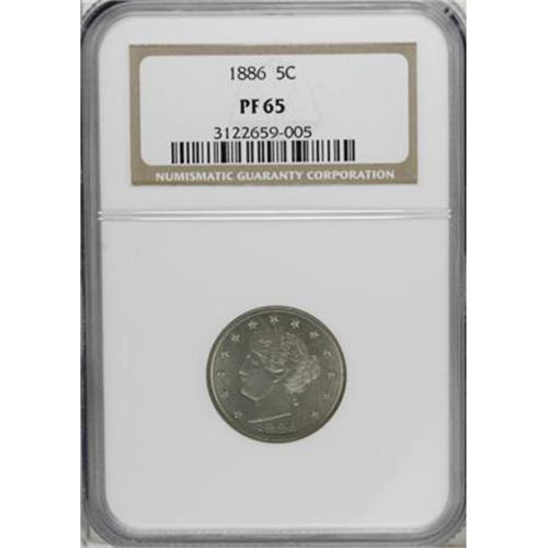 <B>1886 5C PR65 NGC.</B></I> An exquisitely struck Gem proof that displays satiny luster. Both sides are remarkably well preserved. Most of the demand for high-grade nickels with the 1886 date is supplied by proofs (David Bowers, 2006).<BR><I>From The John Stimson, Sr. Collection, Part Two.</B></I><BR><BR><B>Coin Engraver:</B> Charles E. Barber<BR><BR><b>Shipping:</b> Coins & Currency (<a target="_blank" href="http://www.heritageauctions.com/common/shipping.php">view shipping information</a>)
