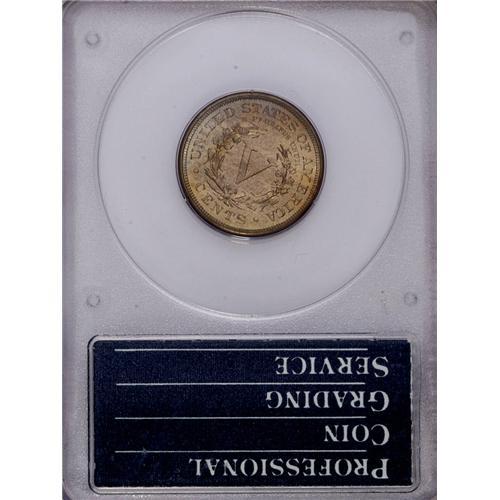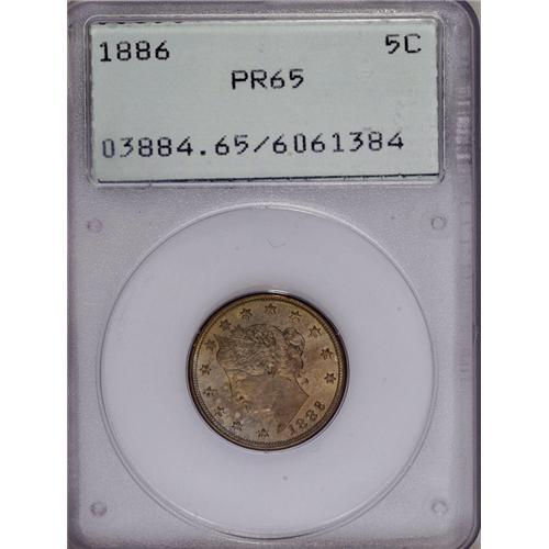 <B>1886<5C> PR65 PCGS.</B></I> The 1886 is a low total mintage date with a real premium placed on the proofs because of the scarcity of business strikes. This Gem proof has moderately reflective fields and each side is draped in rich golden-rose toning with underlying lilac color. <BR><BR><B>Important notice:</B> Heritage usually auctions material at the rate of 200-250 lots per hour. On some occasions eBay Live bid software or the Internet may not be able to keep up with the pace of the auction. We recommend placing a realistic absentee bid now as insurance to avoid disappointment. Occasionally the auctioneer may eliminate or reject an eBay Live bid, and the auctioneer may also reopen a lot after the close of the eBay live bidding (usually because we missed an audience bid), and may reject your bid even if it shows you as the winning bidder. By bidding via eBay Live, you agree that Heritage may award the lot to another bidder at its sole discretion under the circumstances described above or any other reasonable circumstances. Since eBay bids are not shown to us until we open the lot on the floor, we treat those bids just like floor bids. In most cases the floor responds before the eBay bid is presented to us, due to Internet lag time, so for consistency we have made it a policy that floor bids are always considered first over tie eBay live bids. Also please note that all Heritage lots purchased through eBay Live carry a 20% Buyer's Premium. Please make sure you read the Terms and Conditions before you bid. This lot is being auctioned in conjunction with a live floor auction by Heritage Galleries & Auctioneers. All final auction and invoice information will be supplied by Heritage Galleries & Auctioneers, and all other information should be considered preliminary. Lot:985 <BR><BR><B>Winning Notification and Billing:</B> After the FINAL session in this auction is complete, Heritage will send e-mail and snail mail invoices. This process normally takes several days. All final auction and invoice information will be supplied by Heritage Galleries & Auctioneers, and all other information should be considered preliminary. <BR><BR>This auction will be conducted on a live auction floor and over the Internet through eBay Live. If you choose to place an absentee bid, please take a moment to <font color='#0000ff'><u><a href='http://pages.ebay.com/liveauctions/help/before/laabsentee.html'>learn how eBay Live absentee bidding works</a></u></font><font color='#000000'>