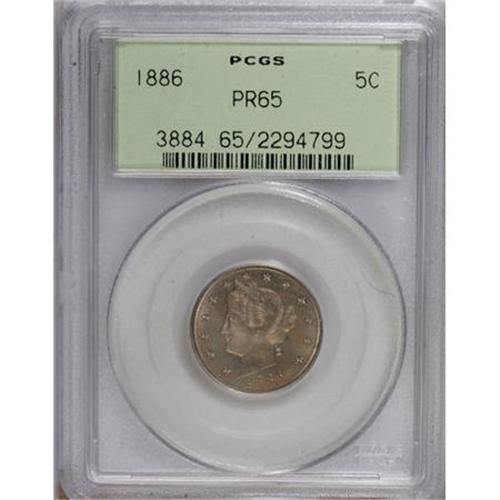 <B>1886 5C PR65 PCGS.</B></I> Pastel orange, lime, and ivory-gray enrich this satiny and exactingly struck key date nickel. Void of hairlines, and only a couple of inconspicuous spots are present. Encapsulated in an old green label holder.<BR><BR><B>Coin Engraver:</B> Charles E. Barber<BR><BR><b>Shipping:</b> Coins & Currency (<a target="_blank" href="http://www.heritageauctions.com/common/shipping.php">view shipping information</a>)