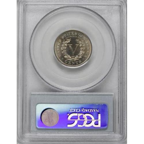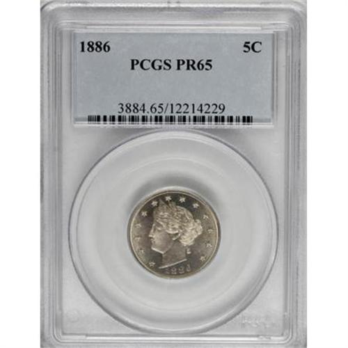 <B>1886 5C PR65 PCGS.</B></I> This is a lovely, sparkling Gem proof example with attractive champagne-gold toning and highly reflective fields. The design elements are fully struck, and the surfaces are impeccably preserved. <BR><BR><B>Coin Engraver:</B> Charles E. Barber<BR><BR><b>Shipping:</b> Coins & Currency (<a target="_blank" href="http://www.heritageauctions.com/common/shipping.php">view shipping information</a>)