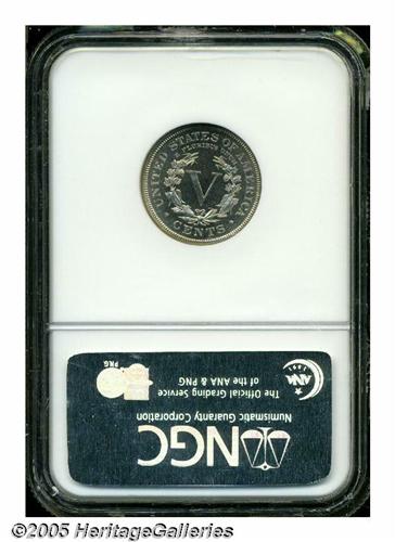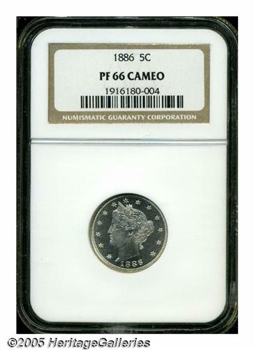 <B>1886<5C> PR66 Cameo NGC.</B></I> Fully struck with rich depth to the dark proof fields, and a distinctly frosted appearance to the central devices. A somewhat granular texture (as struck) in the central reverse fields, was likely on the planchet prior to striking, and should not have effected the numerical grade assessment of the piece. Population: 12 in 66 Cameo, 2 finer (4/05).