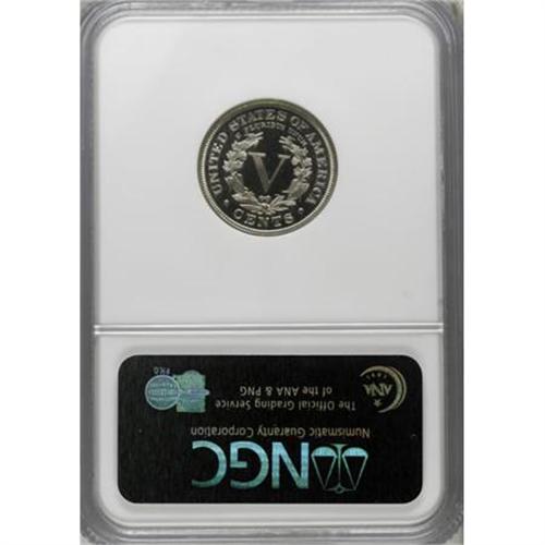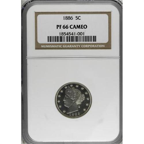 <B>1886 5C PR66 Cameo NGC.</B></I> Though less affected by their business-strike counterparts than the proofs of 1885, the 1886 specimen strikings are always in demand. This gleaming, strongly reflective piece offers bold detail, significant contrast, and delicate sky-blue patina with a touch of rose in the centers. Census: 19 in 66 Cameo, 3 finer (6/07).<BR><BR><b>Shipping:</b> Coins & Currency (<a target="_blank" href="http://www.heritageauctions.com/common/shipping.php">view shipping information</a>\)