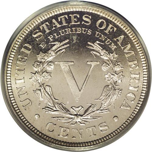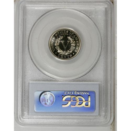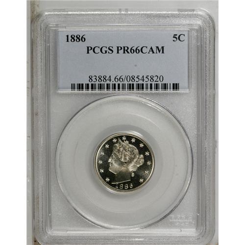 <B>1886<5C> PR66 Cameo PCGS.</B></I> Thanks to their associated business-strike populations, the 1885 and 1886 are among the most desired Liberty nickels. The present example, a representative of the latter, is a remarkable beauty. The devices are exquisitely detailed, and the fields have unusually high reflectivity. A touch of gold on Liberty's neck is the only color on the piece, and a tiny mark on the cheek is the only notable flaw. For sheer eye appeal, this piece is hard to top. Population: 11 in 66 Cameo, 2 finer (9/06).
