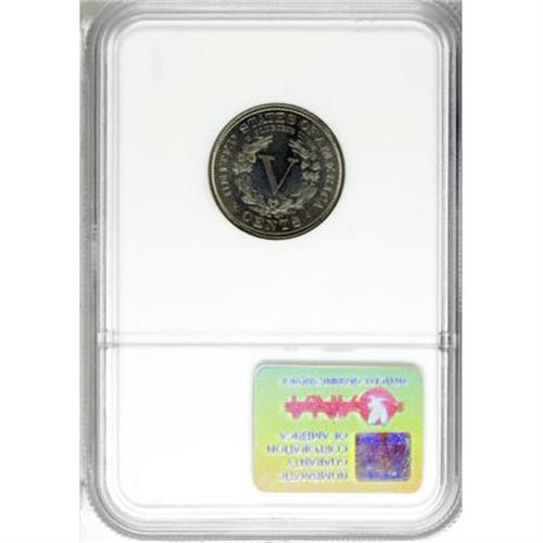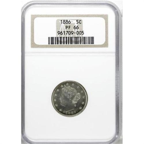 <B>1886 5C PR66 NGC.</B></I> Despite its high output of 4,290 specimens, this proof issue remains popular among collectors due to the modest mintage of its corresponding business strike. The devices are crisply delineated, and the surfaces are pristine. Subtle gold infusions enliven the silver-gray patina.<BR><BR><B>Coin Engraver:</B> Charles E. Barber<BR><BR><b>Shipping:</b> Coins & Currency (<a target="_blank" href="http://www.heritageauctions.com/common/shipping.php">view shipping information</a>)